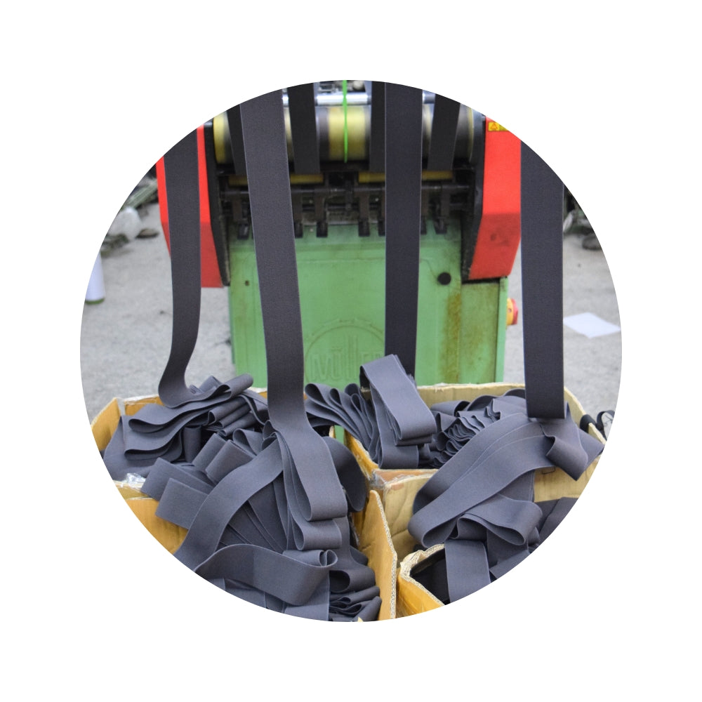Our Intrepid belt spent two years in development, mostly because of the difficulty we had finding an elastic supplier willing to use recycled PET yarn in their knitting machines. When we found Mr. Wang and toured his factory, we liked what we saw: employees who had been working there for years, not months; a bright canteen serving two meals a day; a clean, dust-free workspace; and a whole team devoted just to quality-checking finished elastic. We’ve worked with him ever since.