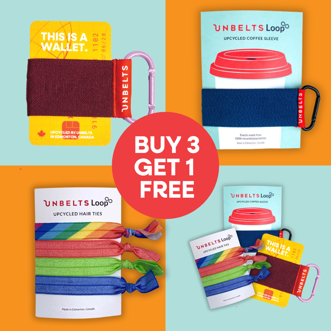 About Hair Ties: These elastic hair ties are upcycled in Edmonton from our excess cloth mask elastic. Super-soft and easy to slip onto a wrist for easy wearing between ponytails. 4 per set.